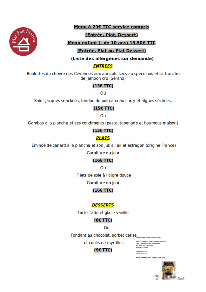 Le restaurant est fermé le lundi midi, mercredi soir, samedi midi et le dimanche toute la journée, sauf pour les 1/2 pensions.